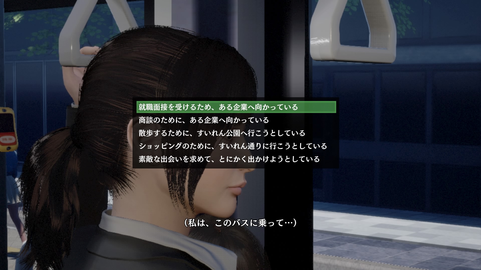 主人公は女性になっていますが、これはデフォルト設定であり性別・名前は変更できますし、都市を訪れた理由も「就職活動」から「素敵な出会いを求めて」など5つの選択肢から選ぶことができます。