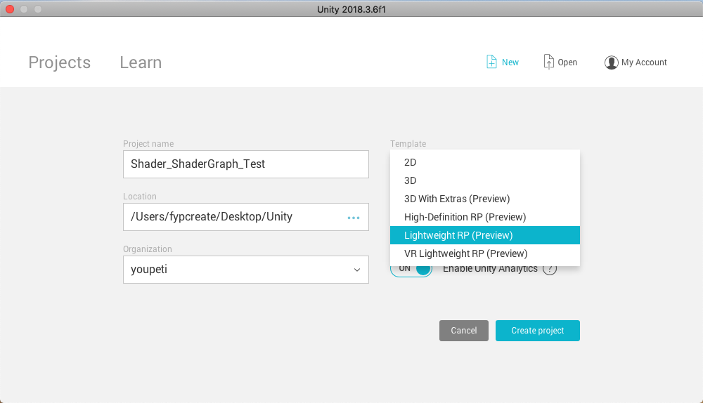ShaderGraph自体はまだ開発を進めているPerview版なので、下記のTempreteでしか動作しません。