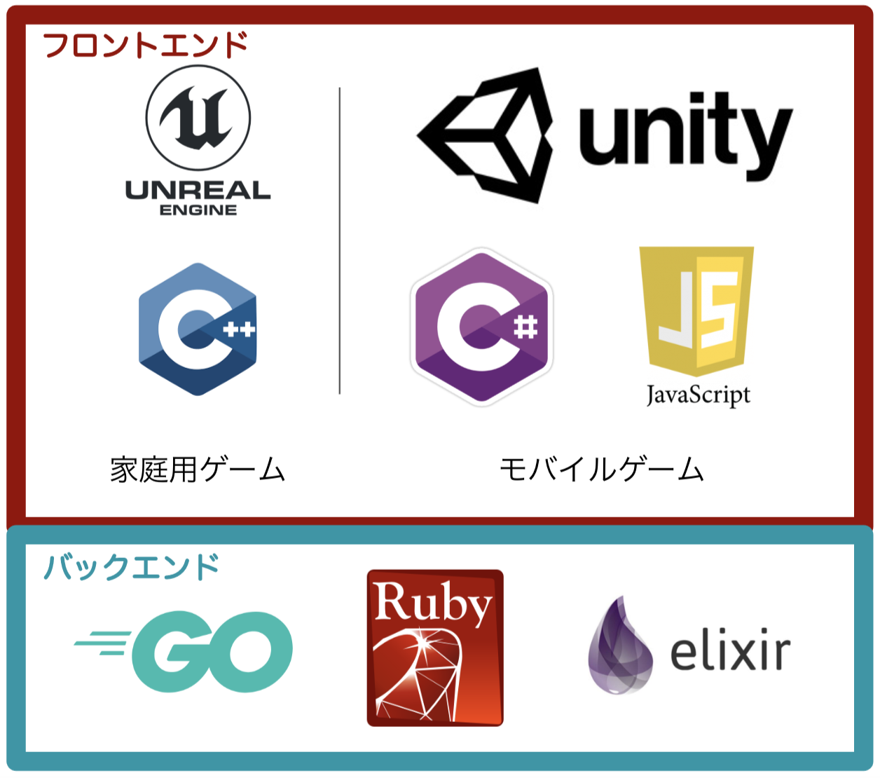 VRプロダクトもUnityのようなフロントエンド開発と、データを処理し、動的な演出を支えるバックエンド開発に分かれており、バックエンド側はスマホゲームで使われる事の多い「GO」や「Elixir」「Ruby」などが活用される傾向があります。