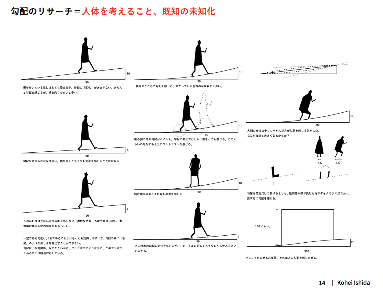 人が勾配を歩くとき、「平面を歩くとき」とは違う筋肉の使い方を”無意識的に”していることを踏まえると、勾配をデザインすることで身体感覚に影響を与えることが出来るという発想です。