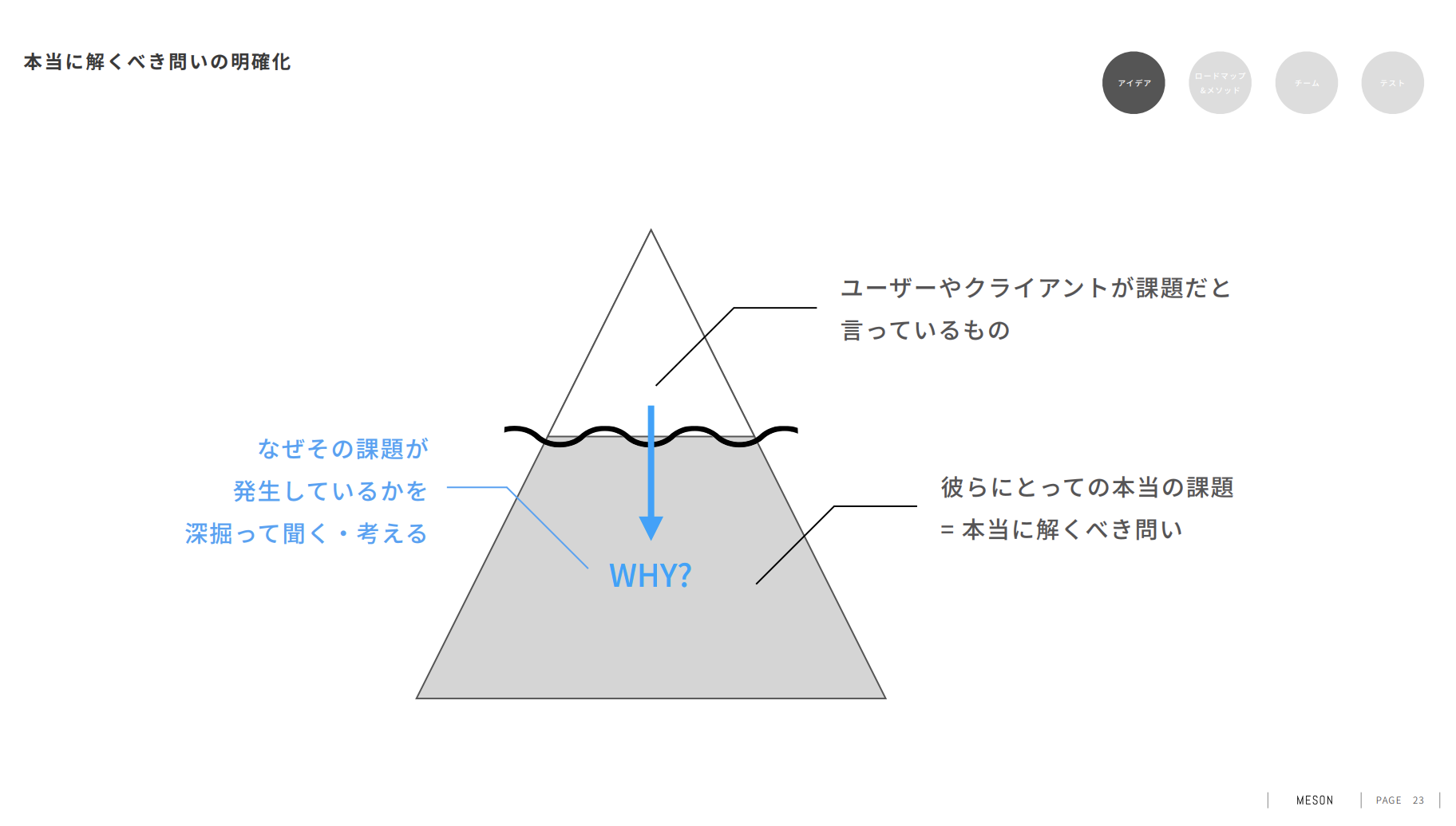 これは、「ユーザーやクライアントが感じている課題は、表面的なものである可能性がある」という前提の下で、