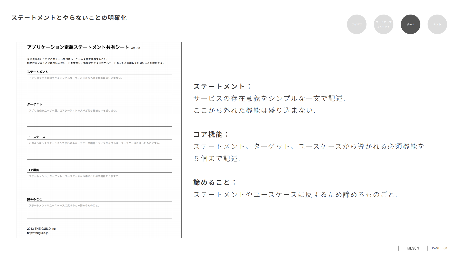実際MESON社では上記のステートメントシートを活用し、サービスの存在意義とコア機能、諦めることを最初に明確にしてチーム内の認識統一を行なっているとのことでした。