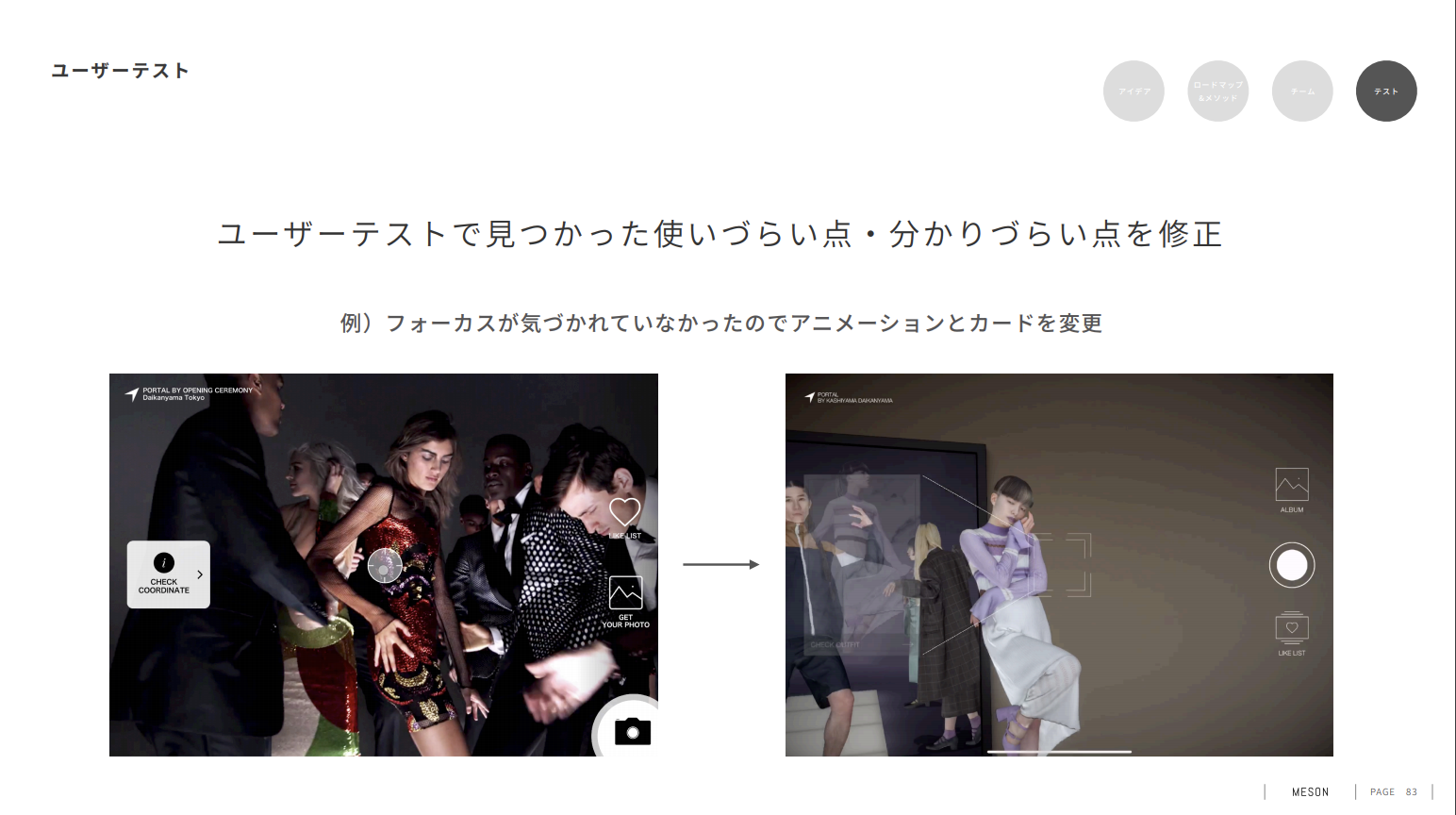 実際に、この2つのテストを実施した中でUIを修正した事例。左側に表示するカードのデザインやアニメーションを変更したことで、直感的で分かりやすくなった。
