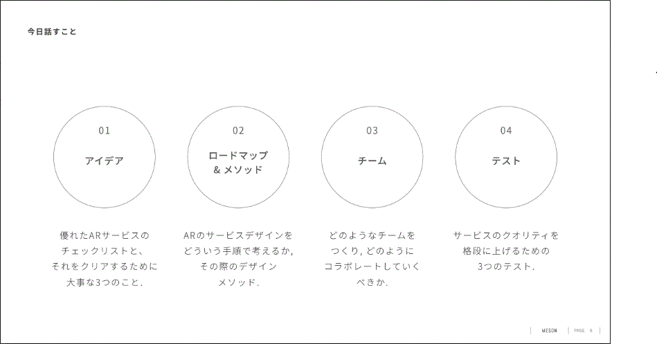 今回は主に「ARサービスをデザインする際の全体像とポイント」というテーマを、以下の4分類で約100スライドという大ボリュームでお話し頂きました。