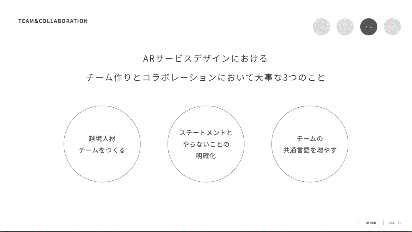 実際にMESON社では、プロジェクトに合わせて「サウンドデザイナーや建築家など」を始め様々な領域のプロフェッショナルをチームに組み込むことでプロダクトの質を高めている、というお話がありました。
