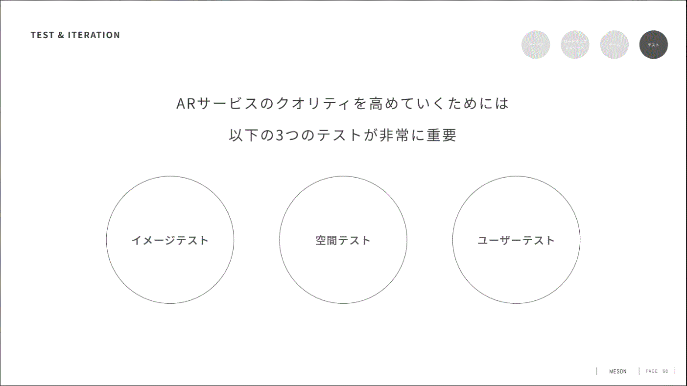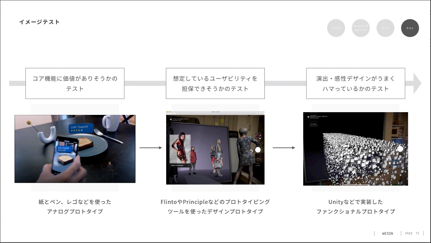 1つ目が「イメージテスト」。空間的な体験であるARサービスを、言語や絵で作るのではなく、具体的にイメージができるプロトタイプを作りながら具体化していくことが重要で、イメージテストでは以下の3つの段階で検証しています。
