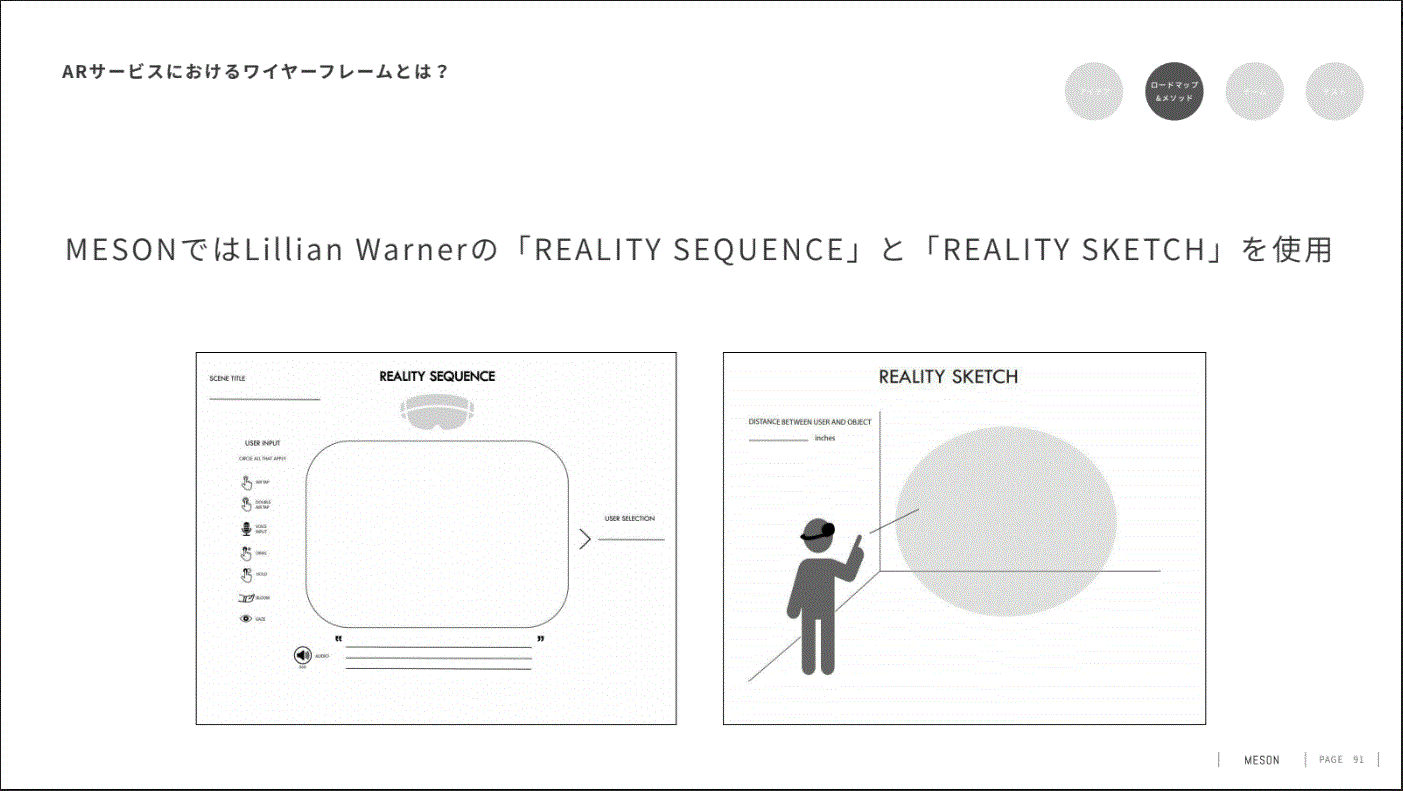 そこで、「REALITY SEQUENCE」「REALITY SKETCH」という2つのデザインツールを活用して、ユーザの視界や環境を考慮したサービス設計をMESONでは採用されているそうです。