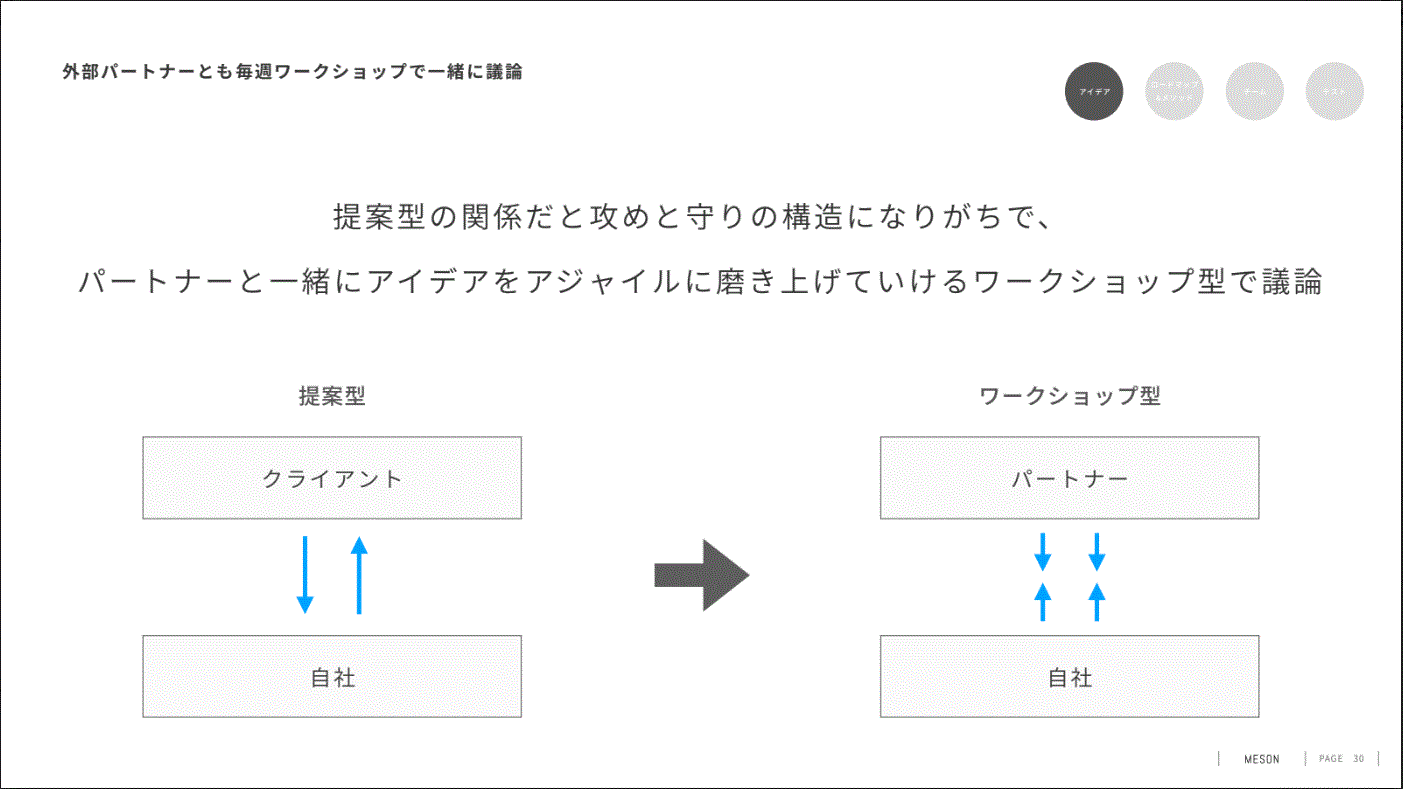 よってアジャイル型の開発を前提としてプロジェクトを推進する必要がありますが、週次レベルでクライアントに実際にデモを体験してもらい、「提案型」ではなく「ワークショップ形式」でディスカッションし、認識を合わせながらブラッシュアップしていくスタイルが最適と提案。