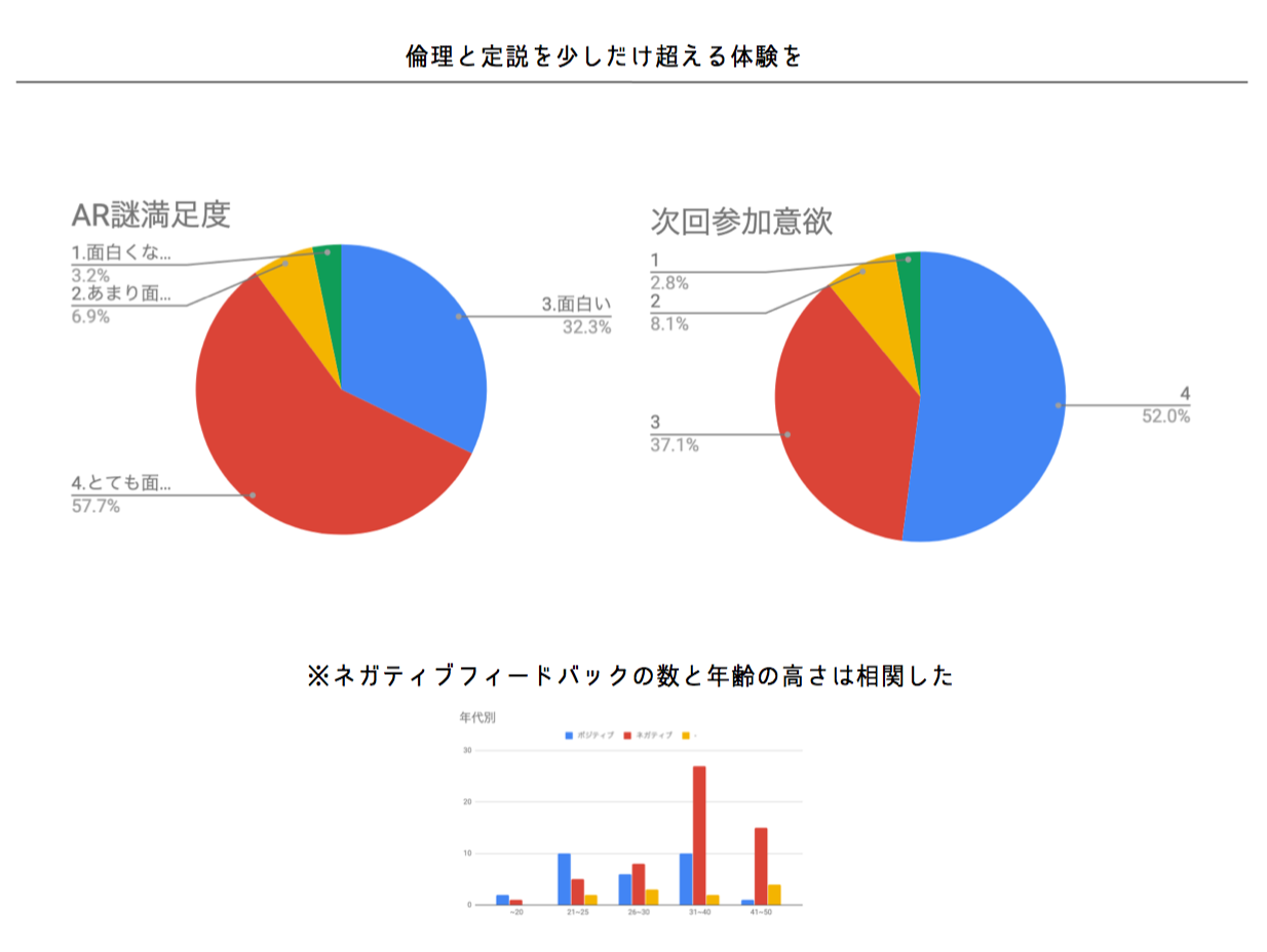 渋谷パラレルパラドックスはプロモーションが功を奏した結果、広告換算費で2億円近くの認知効果があったものの、参加者の数でいうと通常のARを用いない周遊型(歩き回る)謎解きゲームのヒットタイトルには及ばなかったとのことです。