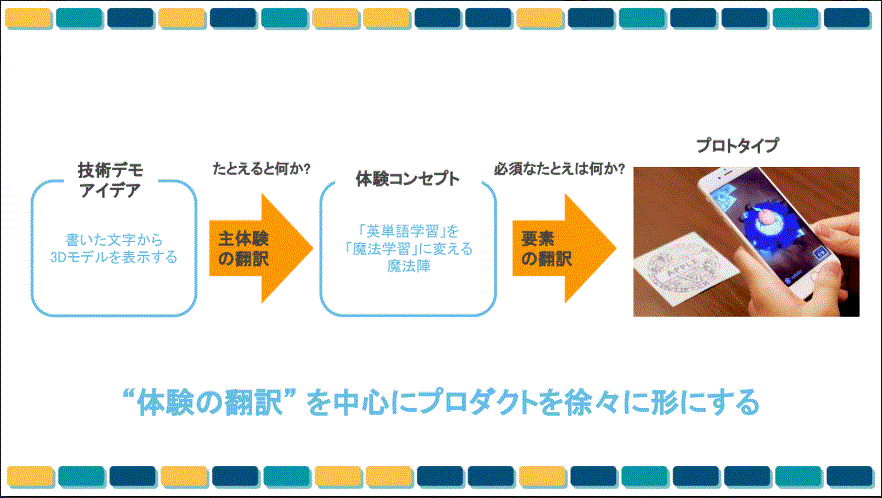 まず1段階目で、実現したい技術的なアイデアをメタファーなどを用いて「一言で伝わる」体験に”翻訳”します。