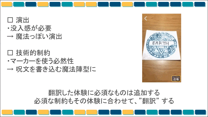 ARマーカーを使用する必要がある、という制約があるのであれば、体験上必須なアイテムとしての魔法陣という違和感のない物とする。