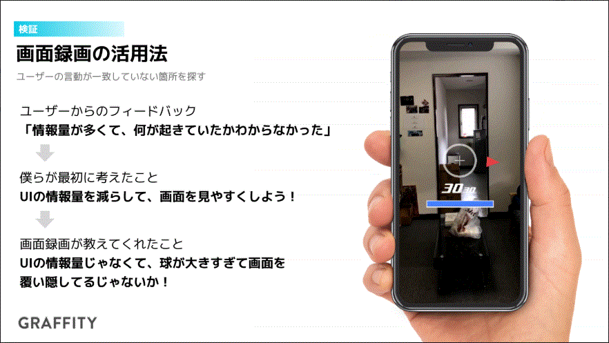 竹下氏曰く、スマホARにおけるユーザーテストとして一般的な「画面録画」は1つの手段になるが、画面録画の場合、スマホとユーザーのインタラクションを観測しづらいため万能ではないと指摘。