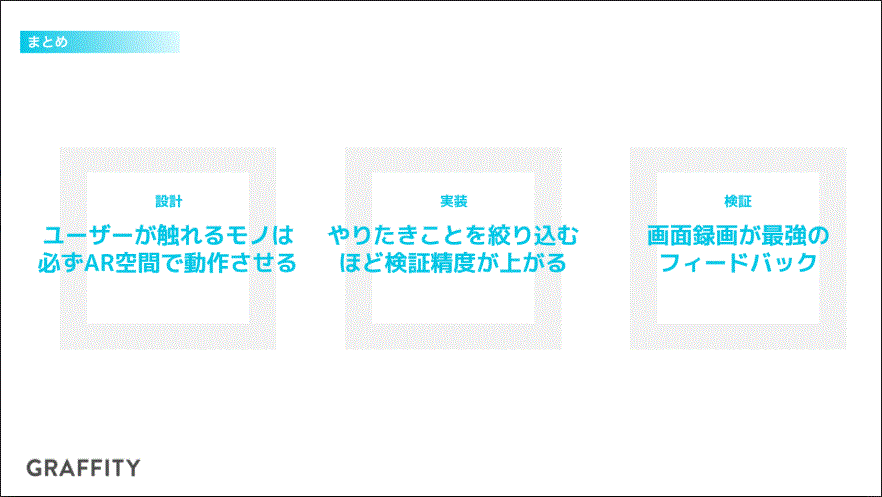 - Spatial Prototype:実際のAR空間で動作する機能をテストする。ユーザに実際に触ってもらってフィードバックをもらうのも良い。