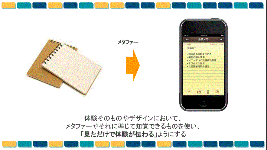 スキューモーフィズム・デザインとは、ユーザが既に体験している既知のものを共通のメタファーとして使い、見ただけで体験を理解できるようにするという考え方です。