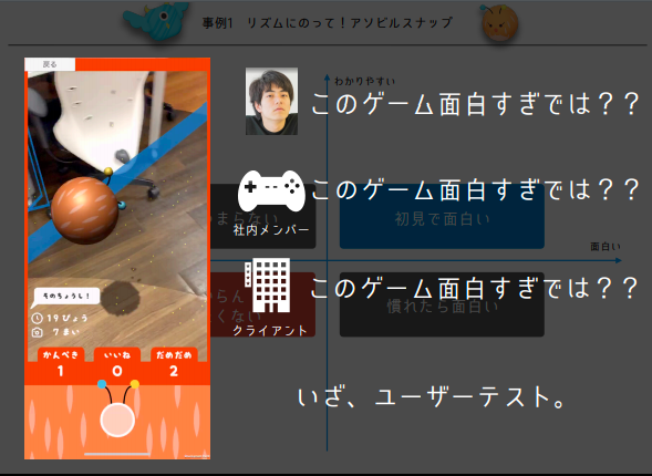 何度もプロトタイプをプレイしていると、自分たちでは面白いか面白くないか客観的に見れなくなってくるため、主観的な見方ではなくユーザーテストを通じた客観的な課題を浮き彫りにしていくべきという点は繰り返し指摘されていました。