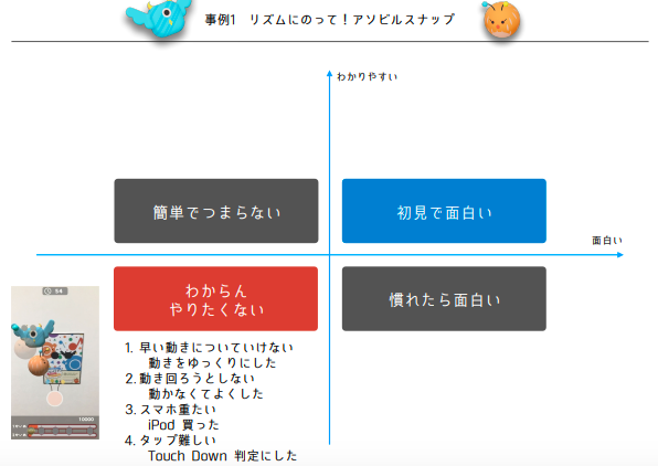 またプレイヤーからは「分かりづらい」「面白くない」といった感想は聞くことが出来ますが、「こうした方がいい」という具体的な改善案までは出してもらう事がないため、課題に対する改善案は自分たちでとにかくユーザーの行動を観察しながら考える必要があるとのことです。