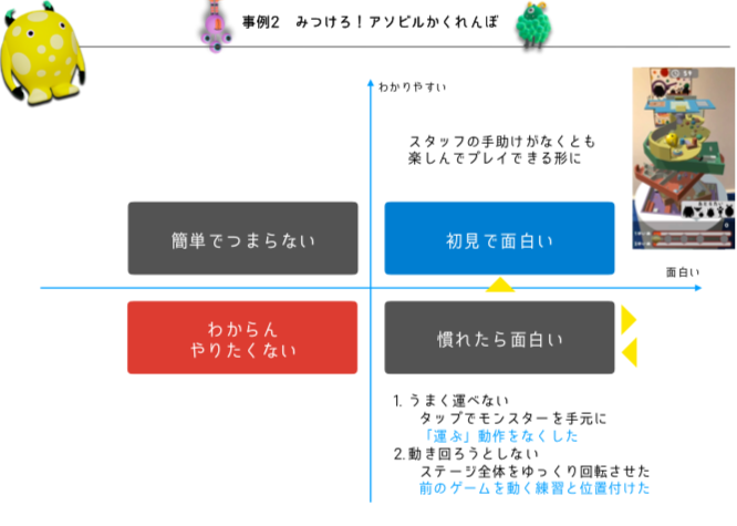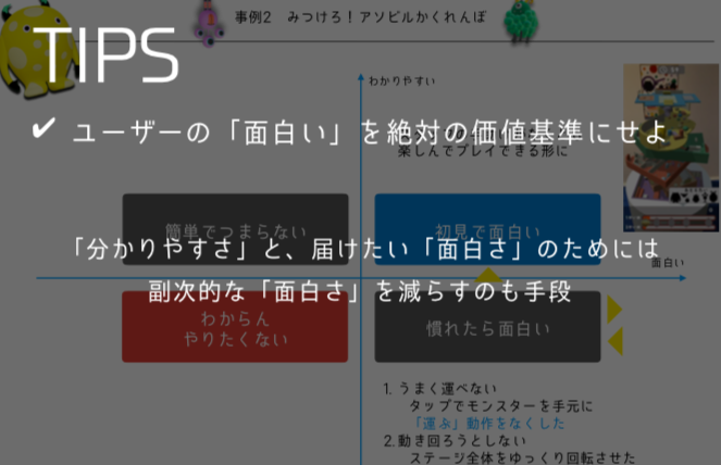 具体的な事例として「みつけろ!アソビルかくれんぼ」というゲームで、プロトタイプでは「モンスターを見つける(本命)」という体験と「モンスターを運ぶ(副次)」という2つの体験を設計したところ、「運ぶ」という機能に対してユーザーから「分かりづらい」という感想から寄せられたそうです。