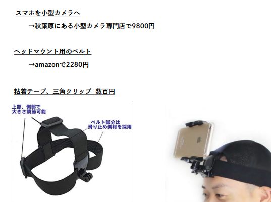 スマホカメラを装着すると重すぎるため超小型カメラを購入し、ヘッドマウント用のベルトとつなぎ合わせることで、低価格で始められるスマホARの高コスパ検証方法を編み出したそうです。(機材合計:13,000円)