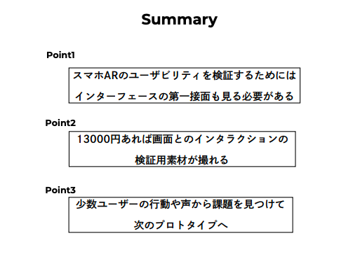 まとめになりますが、川崎氏は「コンテンツを成立させる根幹要素とARの関係性」を定義して、プロトタイプのテーマを決めることが重要であること。