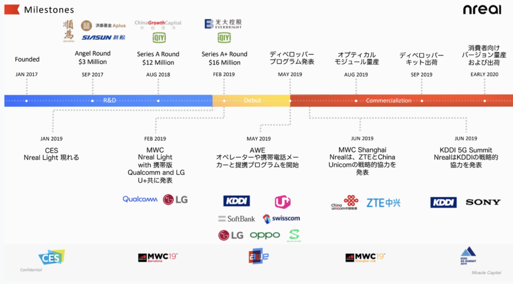 約1年半のR&D期間経て今年2019年にAWEでnreal lightを公開するまでの資金調達・他社とのパートナーシップの足跡が分かります。