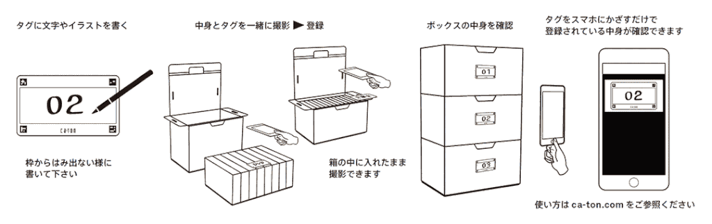 CA-TONにはフタを閉じたままスマホで中身が見えるタグとアプリが付いており、タグにお好きな文字やイラストを書きスマホをかざせば、予め登録した中身の画像を まるで透けているかのように見ることができます。