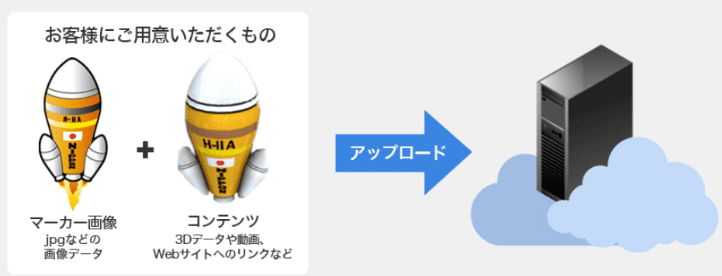 1. マーカー画像(pjegなどの画像データ)とコンテンツ(3Dデータや動画、Webサイトへのリンクなど)を用意してサーバーにアップする。