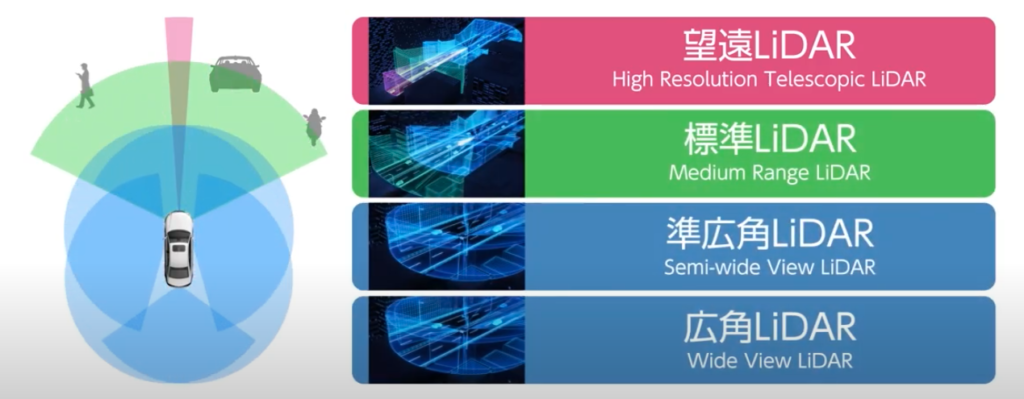 - 広角LiDAR:位置推定、周辺物体の検出・認知、一般道高精度位置推定用の特緻点スキャン(地図位置推定情報更新含む)