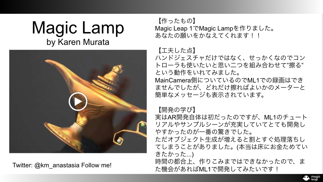 とてもインパクトがありTwitter上でも200RT以上され、今回のMagic Leap Challengeで一番バズったコンテンツとなりました!