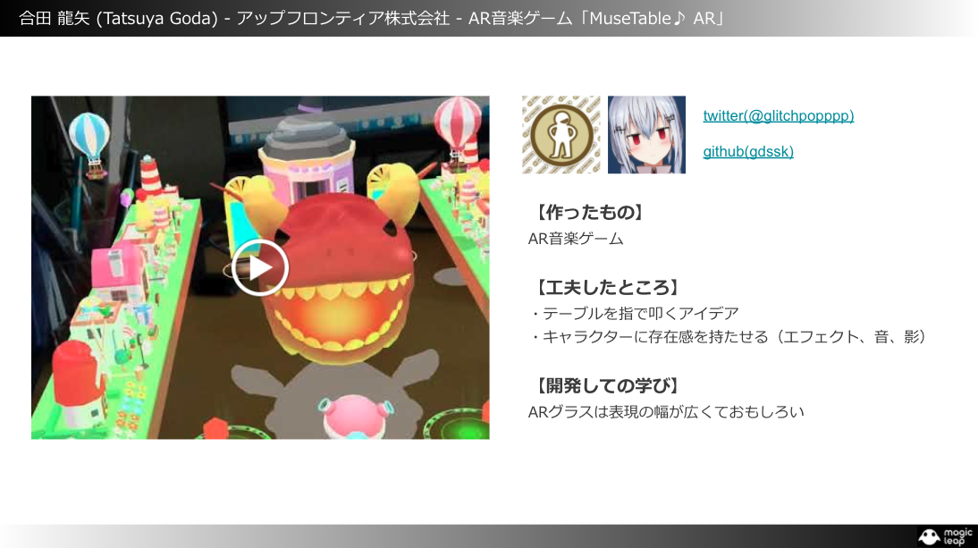 はじめてMagic Leapを触らせていただきましたが、開発環境やサンプルコードが充実していてとても開発しやすく、また何か作りたいと感じました。