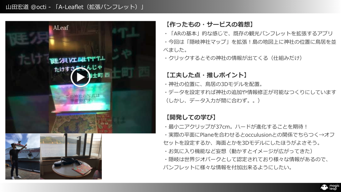 今回の作品は屋外での使用を前提にしましたが、日中はMagic Leapは見づらく、夜は反応しないことが多く大変でした。