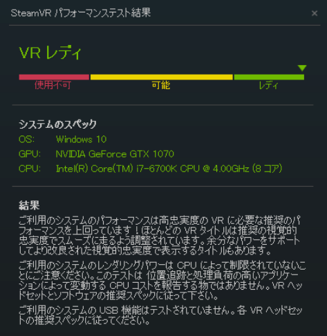 テスト結果は画像のように直感的で分かりやすいもので、大体緑色のゾーンにあれば一通りのVRコンテンツを問題なくプレイできるといっていいでしょう。