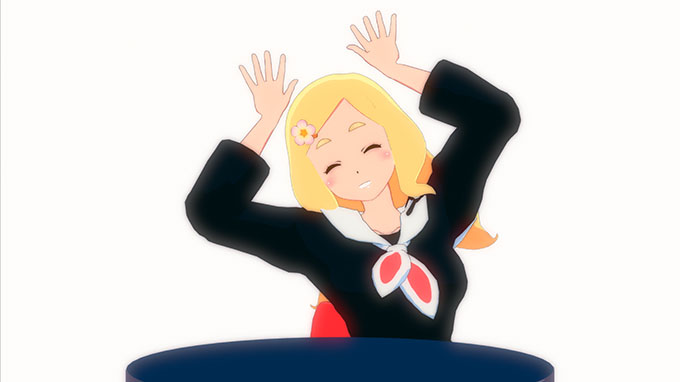見ての通り、外見は金髪のふんわりとした髪の毛が特徴で、花の形をしたヘアピンを着けています。