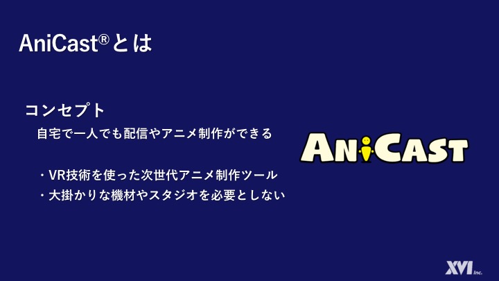 また、AniCastは、VR空間という特性を活かして、大掛かりな設備や人員を必要とせず、全て個人レベルでの制作が可能なツールとなっておりAniCast lab.からは「アニメを作りたい人が作りたいように作れる」がコンセプトとして掲げられています。