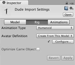 読み込んだFBXファイルの「Import Settings」の「Rig」タブで「AnimationType」を「Humanoid」に設定します。読み込み時にボーンの設定が食い違う事があるようなので、正しく設定し直します。