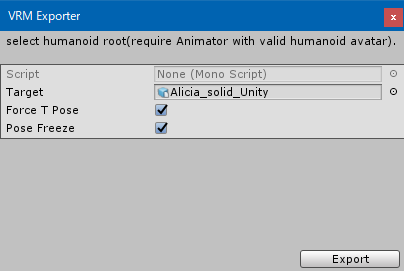 この時は先ほどはチェックを入れた「Force T Pose」「Pose Freeze」のチェックを外してから「Export」をクリックします。