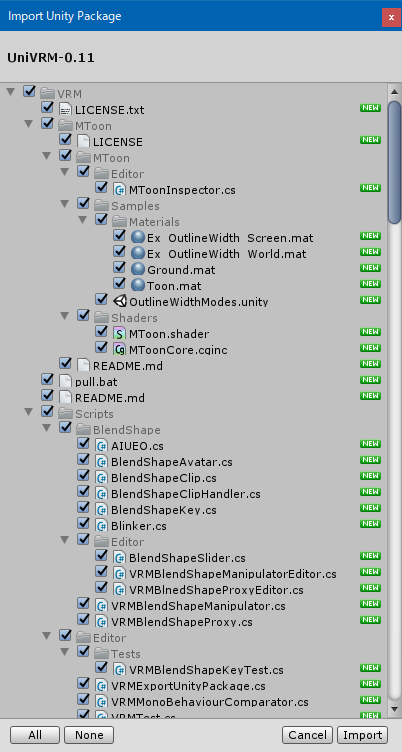 「Import」をクリックすると「UniVRM」がインストールされます。