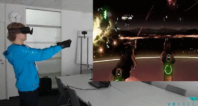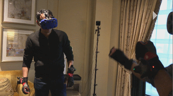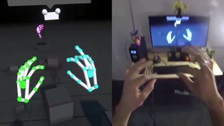 HTCViveではスティック状のコントローラーで手と親指だけを疑似的に動かす方法を取り、Oculus Touchではリング状のコントローラーによって手と3本の指を疑似的に動かしていますが、これではやはり直観的な操作とはなかなかいかず、傍から見ると怪しいダウジングを行っているようです。