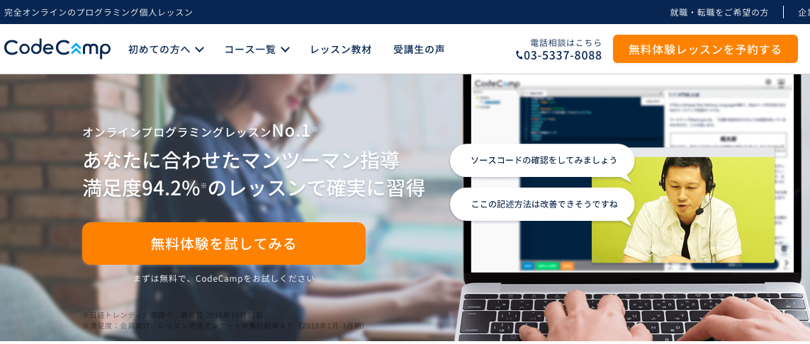 オンライン・マンツーマンのプログラミングスクールとしてトップクラスの実績を持つCode Camp。