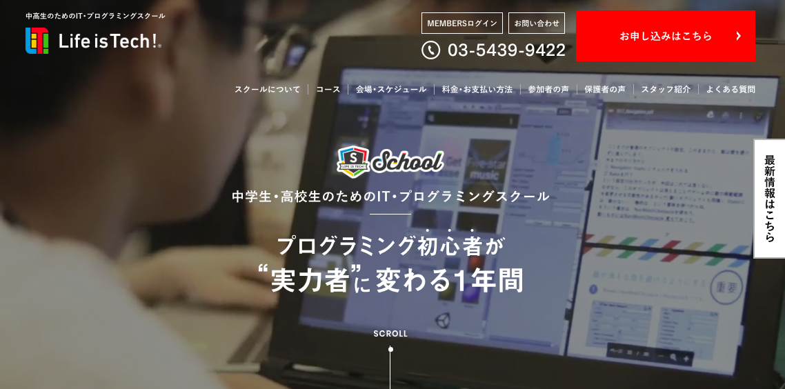Life is Tech ! スクールは初心者が基礎から始めてリリースできるまで実力がつく、中学生&高校生のための本格プログラミングスクールとして定評があります。