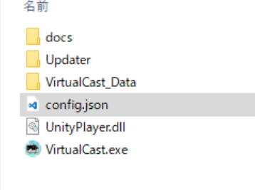 続いて、バーチャルキャストを展開したフォルダー(exeファイルがあるフォルダー)に「config.json」という名前のファイルを作成します。