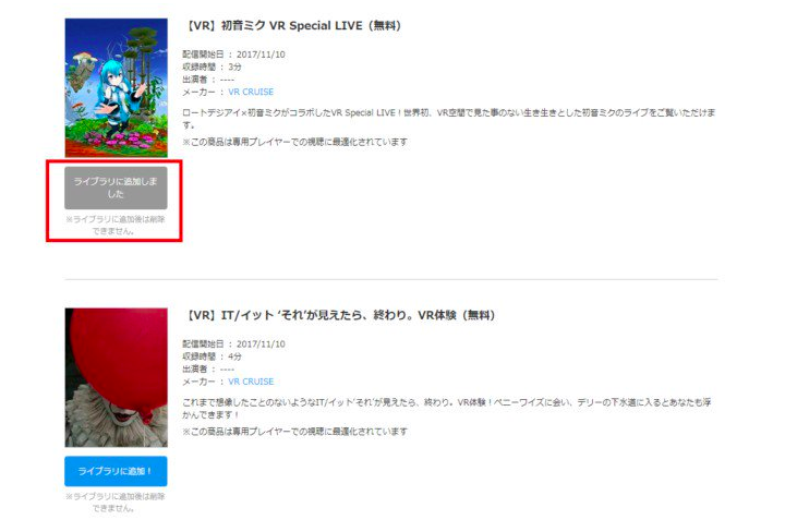 また、VR無料お試し作品も多数公開されており、こちらは「ライブラリに追加!」アイコンをクリックすれ無料で視聴可能です。