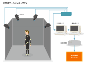コンピュータグラフィックスの動作データや各種シミュレーションに用いられ、ソフトウェアでそのデータを処理することで、生身の人間の動きを再現するので非常にリアルな動作をさせることができます。