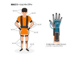 モーションキャプチャには光学式、機械式、磁気式など、複数方式があります。
