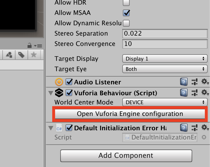 設定が完了すれば、ARCameraのインスペクタでVuforia Behaviour (Script)が操作できる状態になっているはずです。